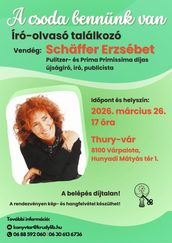 A csoda bennünk van író-olvasó találkozó Schäffer Erzsébettel a Thury-várban 2026. március 26-án 17.00 órakor.