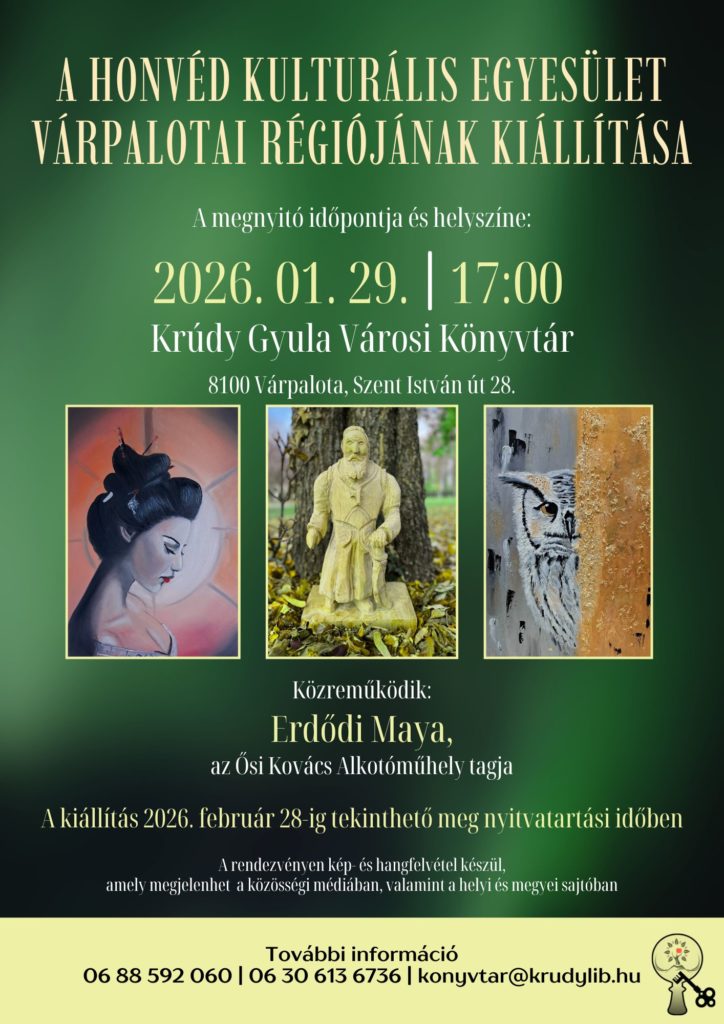 A Honvéd Kulturális Egyesület várpalotai régiójának kiállítása 2026. január 29-én 17.00 órakor a Krúdy Gyula Városi Könyvtárban.