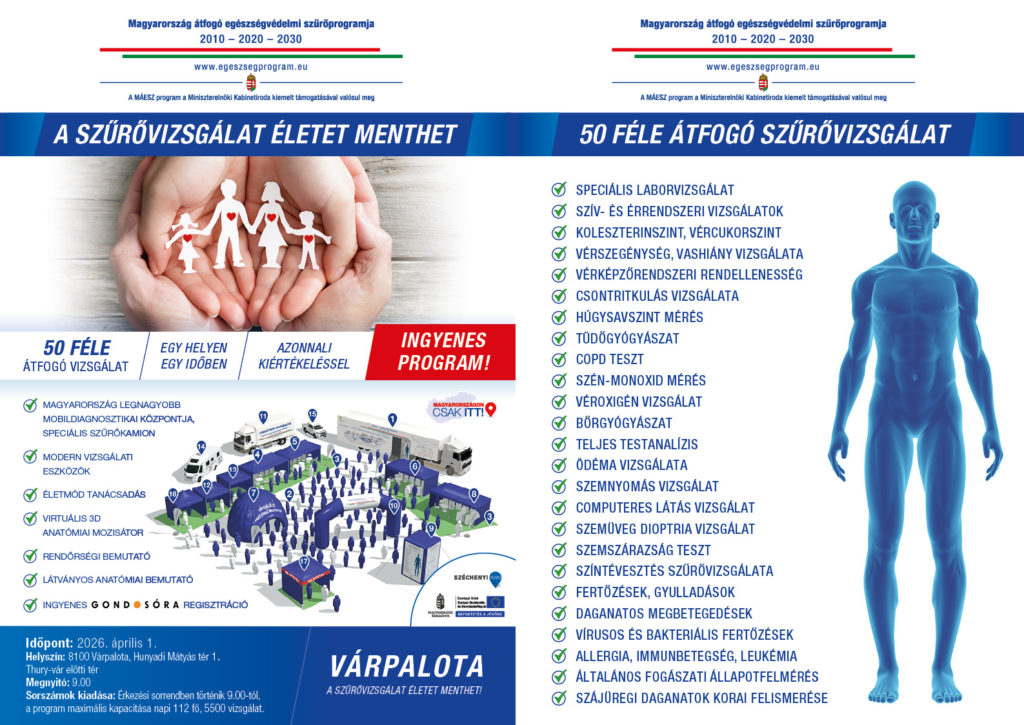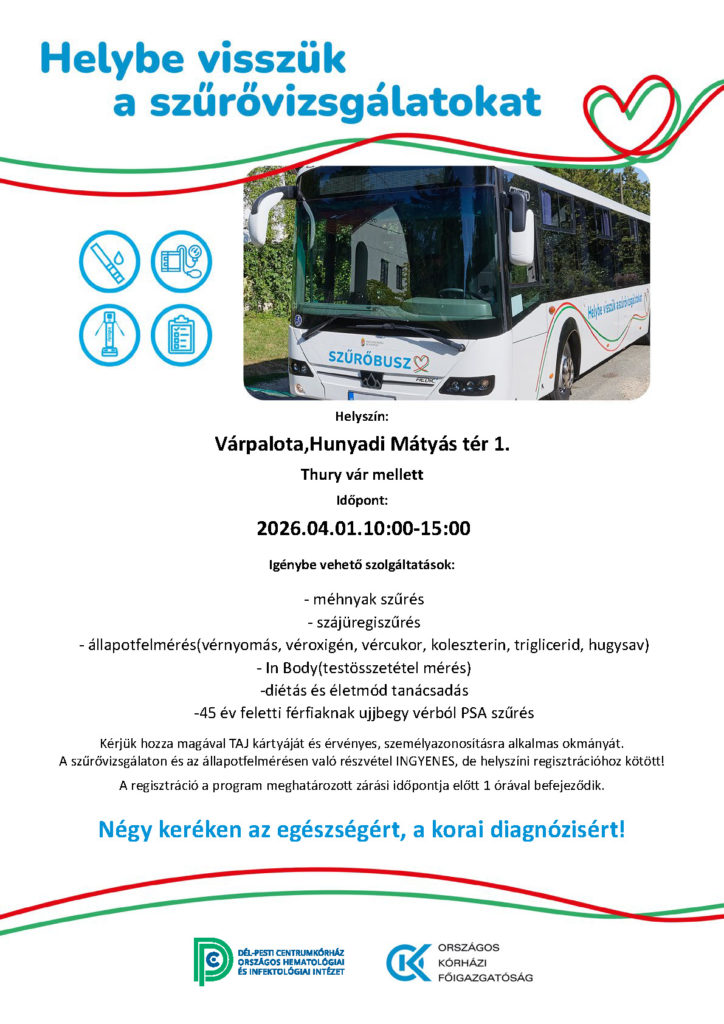 Egészségügyi szűrőbuszok Várpalotán 2026. április 1-jén a Thury-vár előtti Hunyadi Mátyás téren.