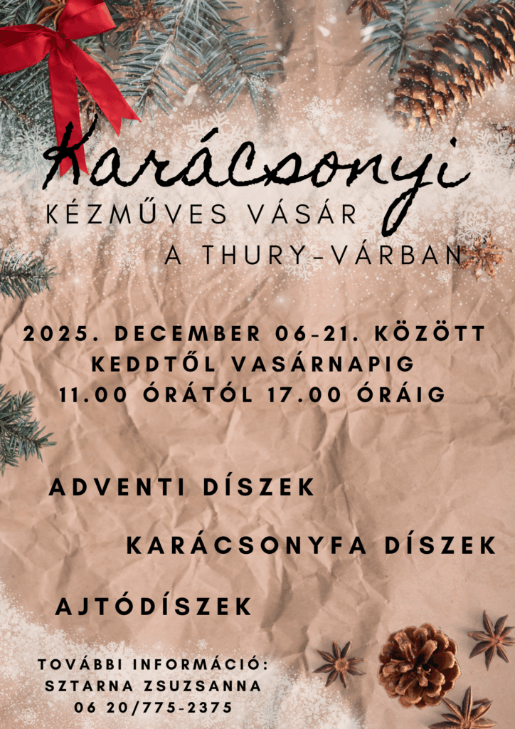 Kézműves karácsonyi vásár a Thury-várban 2025. december 06-21. napjáig 11.00-17.00 óráig.