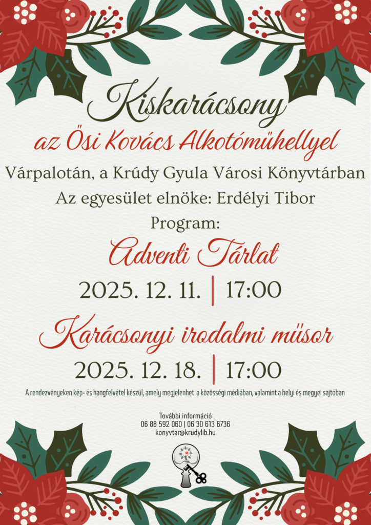 Adventi Tárlat 2025. december 11. (csütörtök) 17:00 | Krúdy Gyula Városi Könyvtár Karácsonyi Irodalmi Műsor 2025. december 18. (csütörtök) 17:00 | Krúdy Gyula Városi Könyvtár